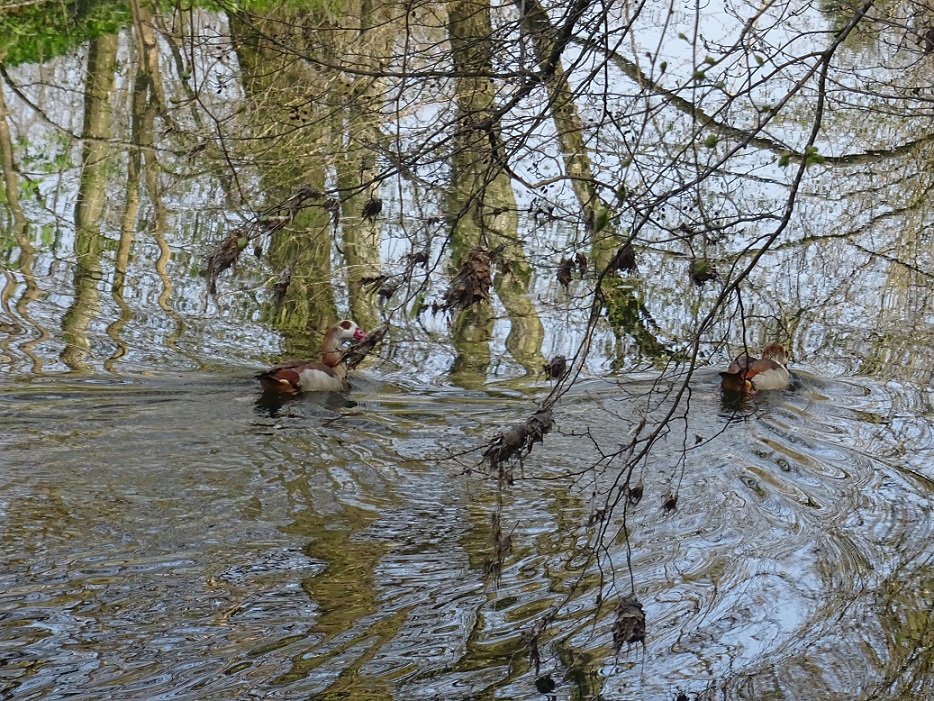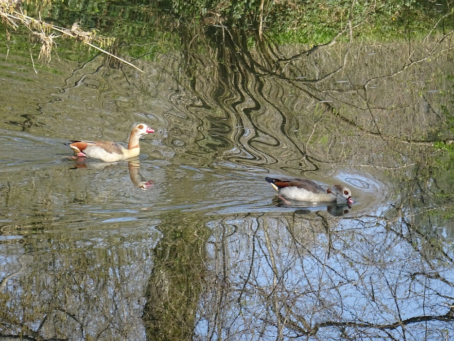 Ich bedaure es sehr, daß der Bestand an Stockenten abnimmt. Und diese immer öfter von den Nilgänsen vertrieben werden. Eine Nilgans in Aktion zu sehen, wie sie heiser-zischend oder laut schnatternd, mehrere Enten vor sich hertreibt, das schmerzt mich. Dieses Paar, war auf der Strecke, die ich entlang der Rems gelaufen bin, aber das Einzigste seiner Art.